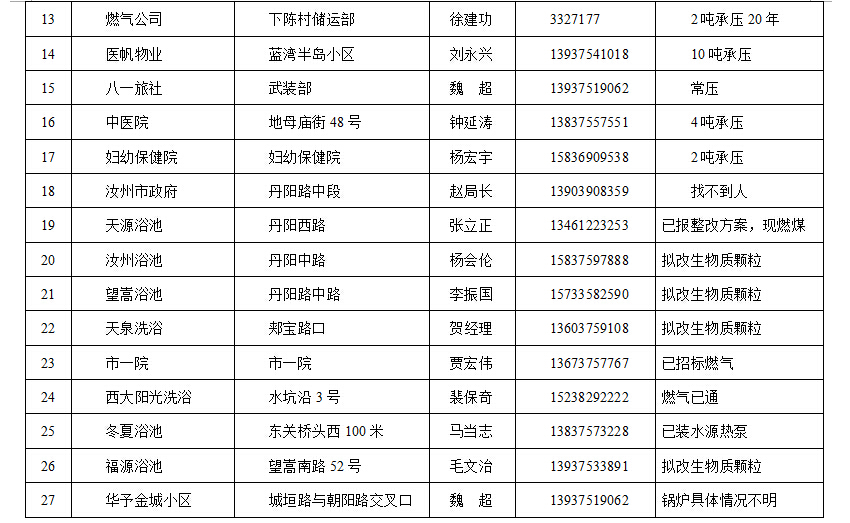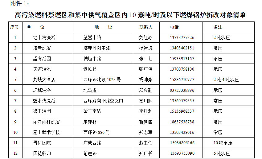 1.加强市区燃煤污染控制。11月30日前,完成高污染燃料禁燃区和集中供气覆盖区内10蒸吨/时及以下燃煤锅炉(包含洗浴行业)拆除或清洁能源(电、气、生物质成型燃料)改造工作。使用生物质成型燃料的要配套专用锅炉和袋式除尘设备,确保达到烟尘排放浓度小于30毫克/立方米,二氧化硫排放浓度小于50毫克/立方米,氮氧化物排放浓度小于200毫克/立方米。逾期不能完成拆改任务者,予以强制拆除,由工商部门吊销营业执照,电业部门停止供电。在拆改过程中要做好影像资料留存,一炉一档,以备省政府核查。