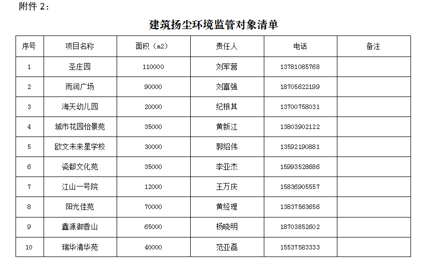 1.扬尘污染整治。加强建筑扬尘环境监管,强化施工扬尘综合治理。落实《河南省建筑施工现场扬尘防治管理暂行规定》,城市建成区内各类建筑施工、道路施工、市政工程等工地必须使用散装水泥;禁止现场搅拌混凝土和配制砂浆,普通砂浆使用散装预拌砂浆;施工道路及作业场地采用混凝土硬化;施工现场内堆放的建筑材料应按使用性质存放,堆放渣土、砂石等易产生扬尘的物质应采用洒水或覆盖等方式;随时清理建筑工地各种垃圾,控制建筑物料、垃圾的扬尘污染;建筑材料运输车辆的车厢应确保牢固、严密,防止在装运过程中沿途抛、洒、滴、漏。施工运输车辆不准带泥驶出工地,驶出工地前进行轮胎冲洗;任何单位和个人不得随意倾倒、抛撒、堆放建筑垃圾;严格执行建筑施工现场扬尘治理6个百分百标准,即现场封闭管理百分之百、场区道路硬化百分之百、渣土物料篷盖百分之百、洒水清扫保洁百分之百、物料密闭运输百分之百、出入车辆清洗百分之百;城垣路道牙改造工程要立即落实物料覆盖措施。